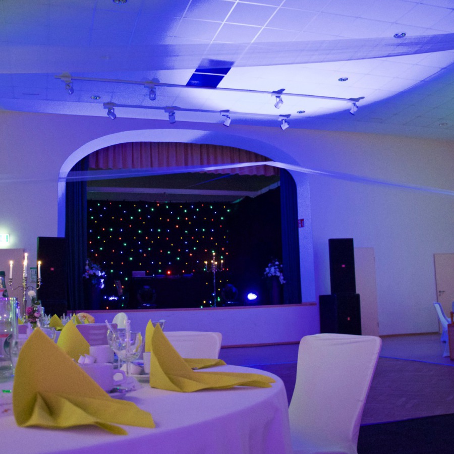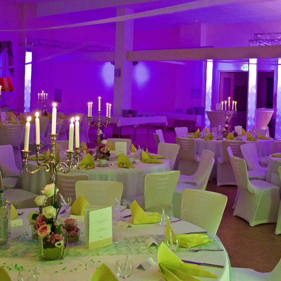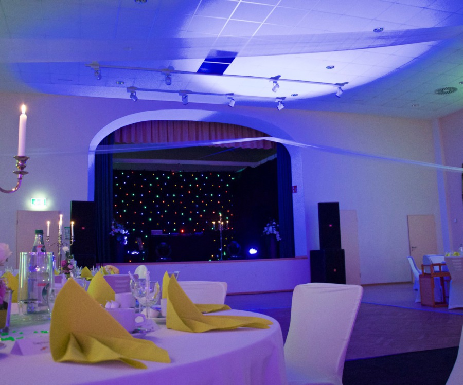Unser Team unterstützt Sie von Ihrer Idee bis zur Umsetzung. Mit unserem eigenen Mietpark statten wir Ihr Event von der Stuhlhusse bis zum Großflächenscheinwerfer komplett aus. Der Saal eignet sich